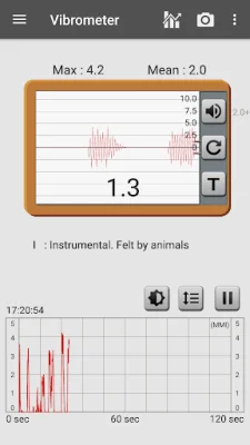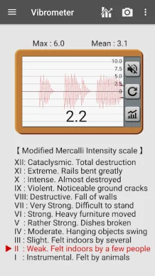 The Vibration Meter, also known as a seismograph, uses the device's acceleration sensors to measure vibrations or earthquakes. It provides a reference for comparison and the measured values are related to the Modified Mercalli Intensity scale (MMI). If the results are inaccurate, the user can calibrate the meter so that the maximum value is around 10-11. It is recommended to use this tool as an auxiliary tool.