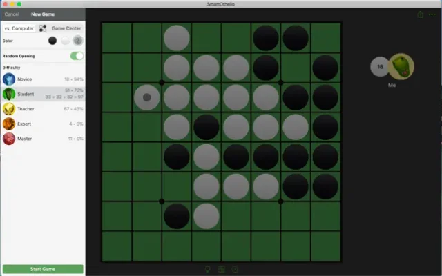 In addition to its various gameplay features, Smart Othello also offers random openings that give both players an equal chance, as well as helpful tools such as hints, undo, and easy game replay. For those looking to study and improve their game, the app also includes a collection of games by top players for replay and analysis.