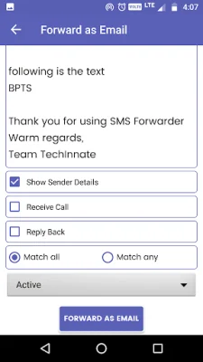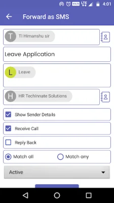 If you're wondering how to use the SMS Forwarder feature, it's simple. Just tap the Forwarder button on the right side of the screen toolbar and click the plus (+) icon to add a new rule. From there, you can customize the rule by adding a specific sender or keywords and choosing the match type. You can also enable options like showing sender details, receiving calls, and replying back. Once the rule is active, the app will automatically forward incoming SMS that match the rule to the specified number.