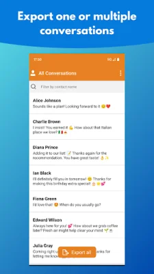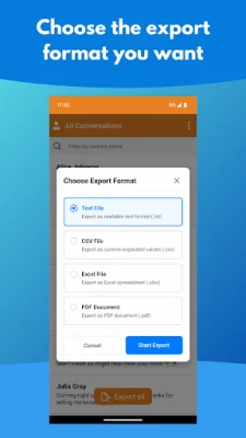 The process of exporting messages is simple and user-friendly. Users can select either one conversation or all of their messages to export. They then have the option to choose from a variety of file formats, including TXT, CSV, PDF, and XLSX. This allows for flexibility and convenience in how users want to save and access their messages.