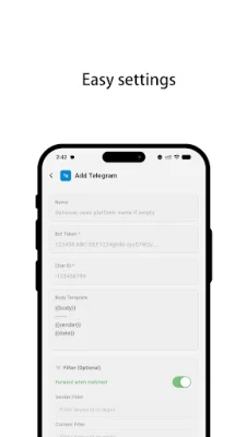 To use this application, users need to add a filter to set the recipient and enter their phone number, email, URL, Telegram, or push service ID. They can also add multiple recipients. Additionally, users can set keywords as conditions for the forwarded messages or leave them blank to forward everything. They also have the option to customize the template for the forwarded messages.