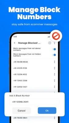 The app also offers number blocking, which allows users to block unwanted numbers to prevent receiving spam or harassment messages. Users can also manage a list of blocked numbers for quick access and modifications. This feature helps to maintain a safe and comfortable messaging environment.