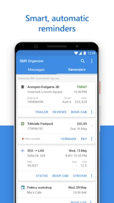 Not only does SMS Organizer provide reminders, but it also offers smart assistance for completing tasks. You can check flight status, do web check-ins, pay bills, book a cab, and more directly through the app's reminders. This feature guides you to the right web page or app at the right time, making it easier for you to complete important tasks.