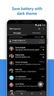 In addition to its practical features, SMS Organizer also offers a dark theme option to help save battery life. You can switch to this theme to see better in sunlight or simply for a change of aesthetic. The app also has an auto-backup feature that saves your messages to Google Drive, ensuring they are safe even if you lose your phone or switch to a new one.