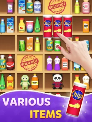 To play Sort Match, simply click on the same 3D items to add them to your shopping cart. The key to success is to efficiently organize the shelves, clear them, and accomplish tasks within the given time. As you progress through the game and complete more levels, you can unlock more of your favorite products and continue the never-ending fun of Sort Match.