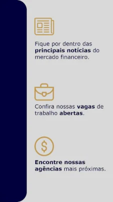 Entre as funcionalidades oferecidas pelo aplicativo, é possível encontrar agências próximas, verificar telefones úteis, acompanhar as últimas notícias do mercado financeiro, acessar análises sobre investimentos, aprender sobre educação financeira com conteúdos exclusivos, verificar oportunidades de emprego e candidatar-se a vagas.