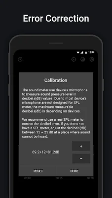 It is important to note that the decibel meter or sound meter (dB meter) on your device is not as precise as an actual Sound Pressure Level Meter (SPL meter) due to the microphone being aligned to human voice. To improve accuracy, it is recommended to use an actual sound meter or SPL meter to adjust the decibel error before use. If you do not have access to an actual SPL meter, you can go to a quiet place and adjust the reading value to 20-30dB.
