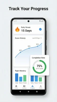 Our app also allows you to track your progress with intuitive progress bars. You can visualize your improvement day by day and see your skills grow. And with 100% offline mode support, you can study anywhere without needing an internet connection. Our clean interface also provides a distraction-free learning environment, and you can receive instant feedback to correct your mistakes immediately.