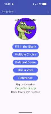 "Conju" the Gator is an application designed to help users master Spanish verb conjugation in a fun, intuitive, and ad-free way. With over 1000 verbs to practice, including a top 100 verb list for focused practice, this app is perfect for anyone looking to improve their Spanish language skills.