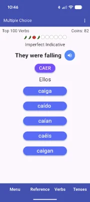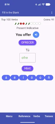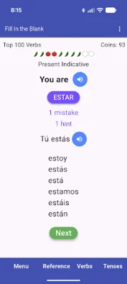 The app also offers smart feedback, highlighting any mistakes made by the user instantly. This allows for immediate correction and helps users to avoid making the same mistakes in the future. Additionally, if a user is unsure of the next letter in a conjugation, they can press the "hint" button for assistance.