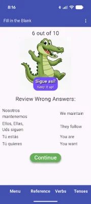 The design of "Conju" the Gator is clear and intuitive, making it easy to use and navigate. It is also beautifully structured and built for real progress. At the end of each test, the app reviews any wrong answers and encourages users to continue their hard work.
