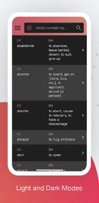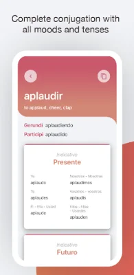 In addition to the translations, the app also includes Spanish conjugations for all moods and tenses. This is a valuable resource for those looking to improve their understanding and usage of Spanish verbs. Users can search for verbs or conjugated forms, making it easy to find the information they need.
