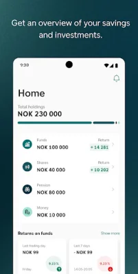 This application allows users to easily view and manage their assets, including accounts, mutual funds, equities (shares), and pension. Users can also set and track their savings goals, choosing how they want to save and monitoring their progress towards reaching their goal.