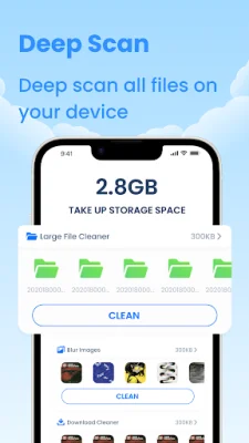SparkCleaner also offers recommended features, such as the junk cleaner and clean up storage space. The large file cleaner feature helps you easily identify and delete useless large files on your device. The deep scan feature categorizes all files for easy deletion, making it simple to free up space. The duplicate image cleaner feature detects duplicate images and helps you choose the best one to keep, effectively freeing up storage space. The screenshot cleaner feature scans and deletes unnecessary screenshots, further optimizing your device's storage.