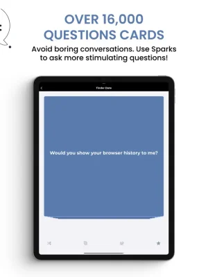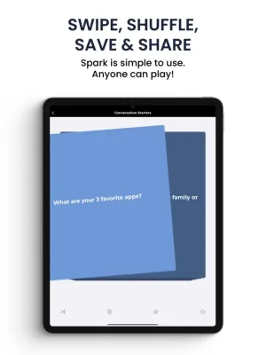 The Sparks app is designed to help users start better discussions by providing over 18,000 swipeable cards, each containing a question that can be answered in-person, via social media, or through a poll. The app is similar to popular games like "20Q", "Never Have I Ever", and "Truth or Dare", making it easy for users to understand and use. It is user-friendly and offers a variety of question categories to choose from.