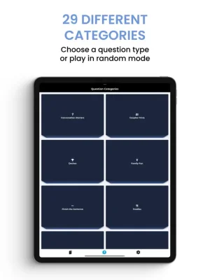 There are 29 question categories to choose from, including topics such as After Dinner, Date Night, Relationships, and Trivia. The app also offers features such as notifications, the ability to save favorite questions, and a random question mode for more variety.
