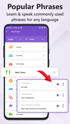 In addition, our Speak and Translate app goes beyond the basics by incorporating a built-in collection of Multilingual Phrases. This feature provides ready-made expressions and sentences in various languages, allowing you to communicate effectively and confidently in different situations. From greetings and common phrases to practical sentences for travel, our all languages translator app equips you with the tools you need to navigate language barriers and connect with people from diverse backgrounds.