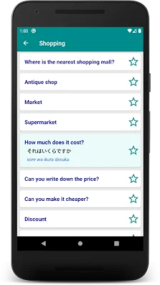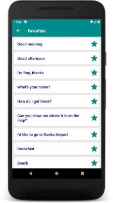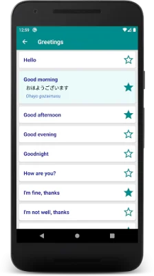 The app also features native pronunciation for each phrase, ensuring that users can speak Japanese correctly. It is completely offline, meaning that no internet connection is required to access the content. Users can search for phrases using either Japanese or English keywords and save their favorite sentences for later review.
