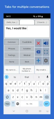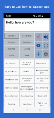 The app is a customizable tool that allows users to create categories and phrases, which can then be placed on buttons for easy access. These buttons can be used to create messages that can be shown or spoken through text-to-speech technology. Users also have the option to type their own text using the keyboard.