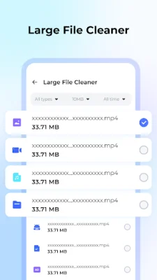 The large file cleaner allows users to browse and manage their files by categories. It identifies large files that are taking up storage space and allows users to sort them by size, date, or type for easy cleanup. This feature helps users to quickly identify and delete large files that they no longer need, freeing up valuable storage space.