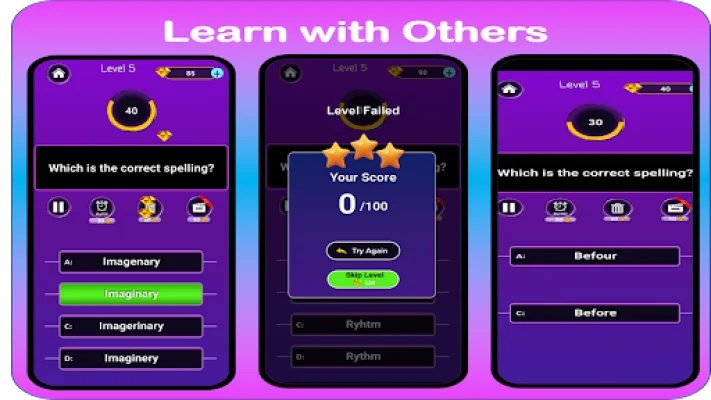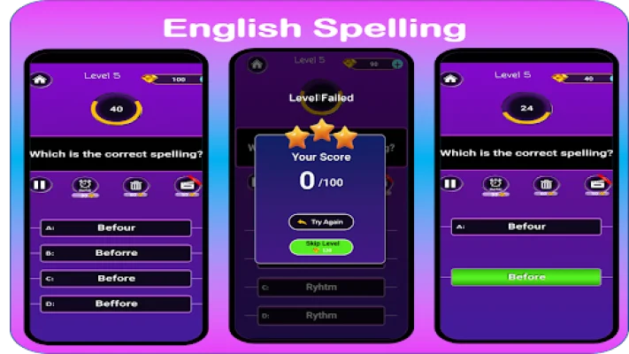 The game consists of multiple-choice questions with four possible answers. Players must choose the correct spelling for each word. With a variety of quizzes available, you can practice and challenge yourself daily.
