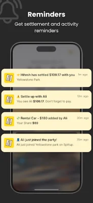 The app also has a clear and transparent dashboard where you can track all group expenses in one place. You can see the total expenses, your individual share, and pending settlements clearly and instantly. Additionally, Splitup sends smart reminders and notifications to help you stay on top of your expenses. You will be notified instantly when a new expense is added and can send gentle settlement reminders when someone owes you. Both parties will receive a confirmation when a payment is settled.