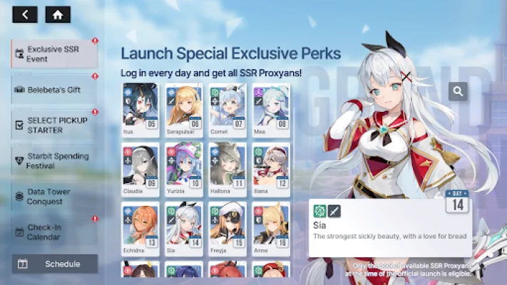 This application is a game that allows users to log in and receive one of 37 Proxyans guaranteed. By signing in daily, users can claim their SSR Proxyans. The game is set in a world where humanity has fallen and the player's goal is to save it from the hostile force known as the Redshifts. The player is accompanied by unique AI girls called Proxyans, and together they must unravel the mystery behind humanity's extinction.