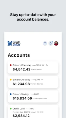 Our app also offers convenient ways to connect with other financial institutions. You can deposit checks using remote deposit capture, transfer money between Credit Union accounts and accounts at other institutions, and use our account aggregation tools to view balances and transactions for all your accounts in one place.