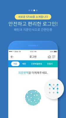 STAX는 고객의 취향에 따라 다양한 로그인 방식을 제공합니다. 지문, 패턴, 간편비밀번호, FaceID(아이폰X), 공인인증서 등을 통해 로그인할 수 있습니다.