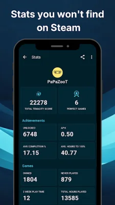 In addition to these features, Tenacity also has social and customization options. You can compare your progress with your friends and see who the real completionist is. The app also supports multi-profiles, making it easy to switch between different Steam accounts. And to make the app truly yours, you can personalize it with multiple color themes.