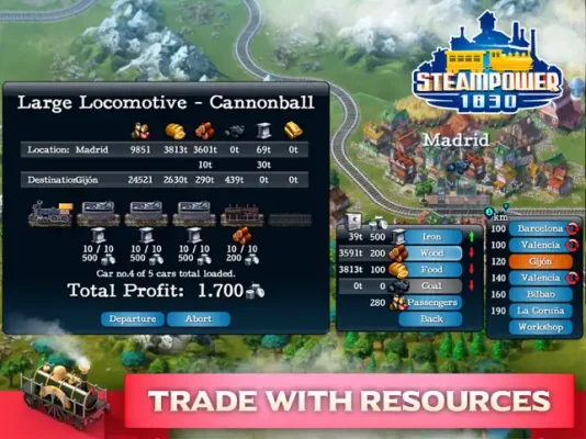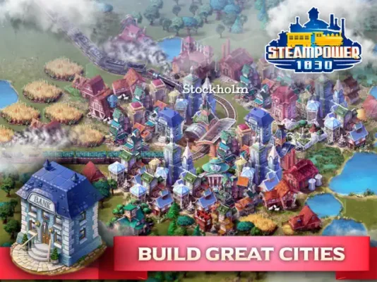 To play SteamPower1830 Railroad Tycoon, players must design their own railroad world using simple touch controls. They can establish cities, build locomotives, and expand their railway network to ensure the growth of their cities. In order to keep their cities thriving, players must also produce and mine essential raw materials. The main objective is to transport passengers and raw materials using steam trains, while also upgrading their locomotives, train stations, city structures, and track layout. To win a map, players must reach a certain total population within a given amount of time. The game also offers a Single-Player Campaign with 30 European country maps to conquer.
