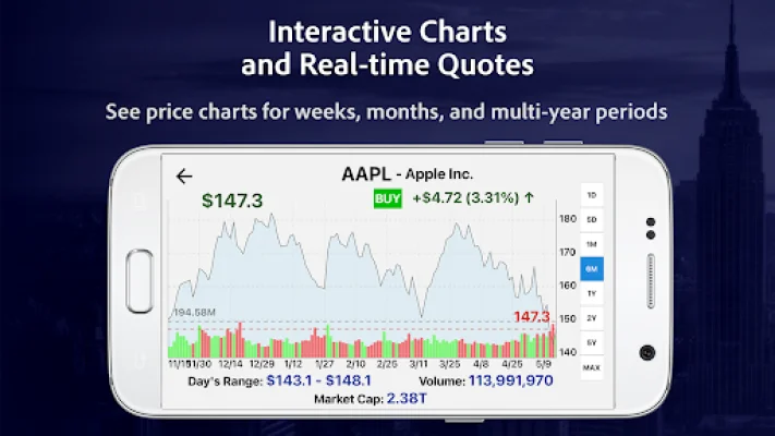 The app also offers charting tools for traders and investors to see intraday, weekly, monthly, and multi-year price and trading volume changes. Interactive charts display real-time prices, including pre-session and after-hours trading, as well as other fundamental data for technical analysis. Users can also stay updated with the latest financial news and ETF and stock market news from top business online resources and American funds.