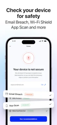 StopScam also offers a cybersecurity assistant and security shield, which includes a 24/7 chat with an AI security expert for advice on breaches, password leaks, and device hardening. The app also has a color-coded shield on the home screen that displays a user's live Security Score and monitors various aspects of their device's security, such as email breach exposure, compromised passwords, Wi-Fi encryption, and more.