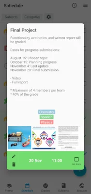 SchoolMate is an all-in-one application designed to help students stay organized and on top of their academic responsibilities. With SchoolMate, you can easily schedule exams, projects, and other important tasks, and set notifications and alarms to remind you of their due dates and times. This ensures that you never miss a deadline and can manage your time effectively.