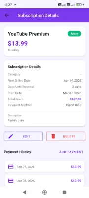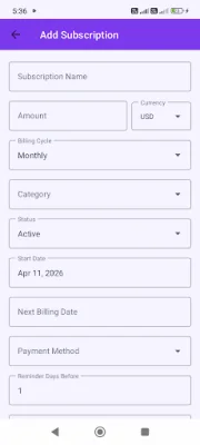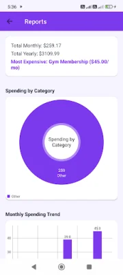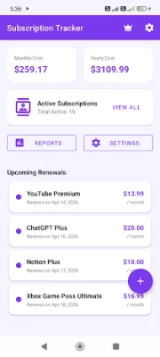The app also features an upcoming renewals widget that gives you a preview of all your subscriptions that are renewing in the next 7 days. You can also set custom reminder days before each renewal through reliable background notifications. The payment history feature allows you to log every charge per subscription, including the amount, date, and notes. Additionally, the app provides visual reports and charts that show your spending by category, cycle, and trend over time.