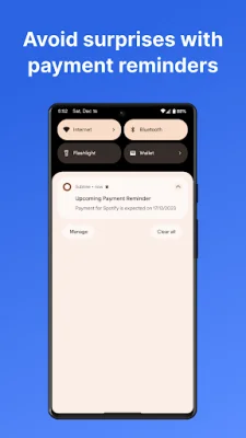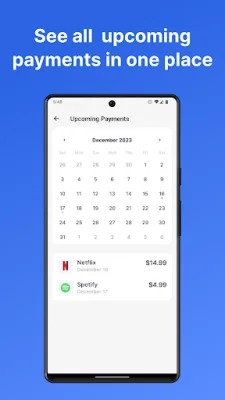Never miss a payment again with our smart and timely bill reminders. Subtree sends push notifications in advance of your next payment date, ensuring you never pay for something you don't want. Our intuitive bills calendar also provides a clear visual representation of all your scheduled payments, making it easier to plan your finances.