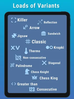 The app boasts an impressive list of variants, including Classic, Killer, Sandwich, Thermo, Diagonal, and more. New variants and boards are added regularly, and some boards even have multiple variants to keep things interesting. Each puzzle has a unique solution and is designed by Logic-Wiz.