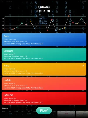 After completing a game, the player will receive their overall stats, including total time spent, best time, average time, overall score, hints used, and mistakes made. The app also has a graph that shows the player's progress over time. As the player completes more difficult levels, they will earn more points. Each higher level gives twice the number of points as the previous level.