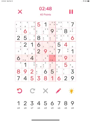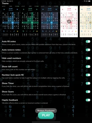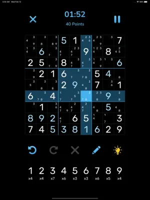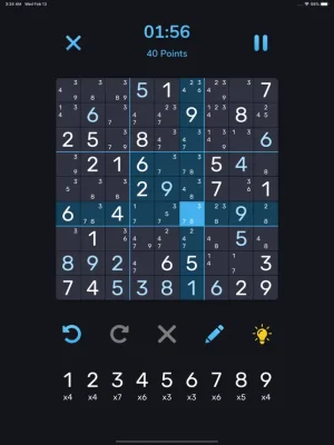 The game can be paused, and the player can resume their previous game when they come back. The app also has an auto-fill feature for notes, but the developers encourage players to disable this setting and fill in notes manually to keep their brain active. Manually filling in notes also earns the player extra points.
