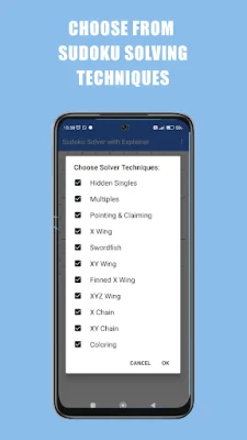 The app covers a wide range of techniques, from basic ones like Singles and Hidden Singles to more advanced strategies like X Wing and X-Y Wing. It also includes very advanced algorithms such as X-chain and X-Y Chain, making it a comprehensive resource for sudoku enthusiasts.