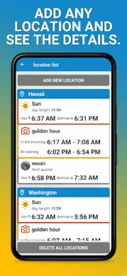 Our app uses GPS to determine your location, making it easy to get accurate sunrise and sunset times for wherever you are. But that's not all - you can also add multiple locations to the app, making it perfect for travelers who may be visiting different places during their vacation.