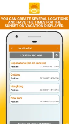 And to make things even more convenient, our app also has a list of favorite places where you can save your most visited locations and easily access their sunrise and sunset times. So what are you waiting for? Download our free "Sunrise and Sunset App" now and never miss a beautiful sunrise or sunset again!