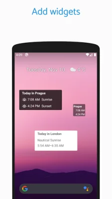 This application allows you to easily access sunrise and sunset times for any location you choose. Not only can you view this information for one specific place, but you can also add a widget to your home screen for quick and convenient access. Best of all, this app is completely free to use!