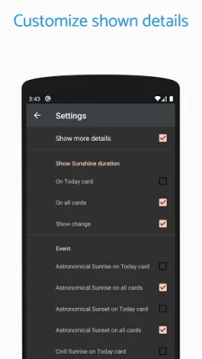 For even more detailed information, there is another in-app product called "More Details" that can be purchased. This feature enables you to view additional details such as astronomical, nautical, and civil sunrise and sunset times, as well as the duration of sunshine and changes in day length from the previous day. These details can be displayed on the app's daily card or on all cards, as well as on the widget. To purchase this feature, open the app's drawer, click on "Settings", and then select "Show More Details".