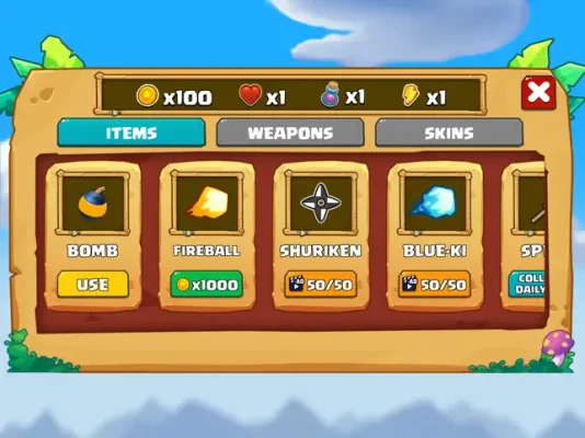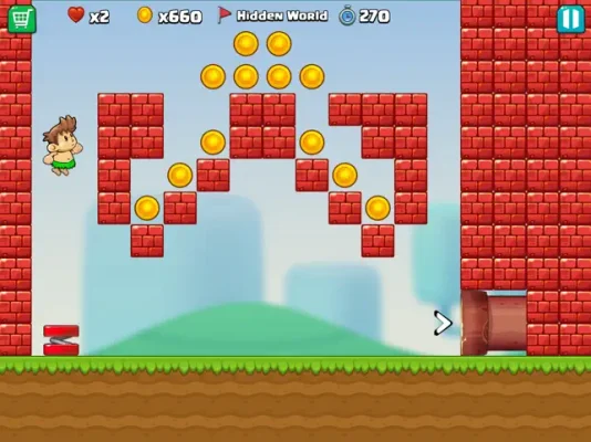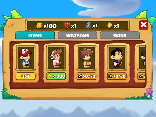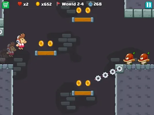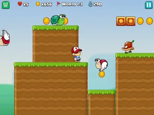 To play Super Billy: Jungle Adventure, you will use buttons to move, jump, and attack. You can also collect power-up items to gain special powers and abilities. As you progress through the game, you can collect coins to purchase items, skins, and special weapons to help you on your adventure.