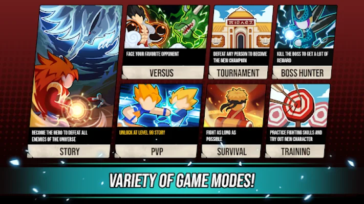 The game features 7 different modes, including PVP mode where you can compete with players from all over the world to reach the top rank. There is also a versus mode where you can team up with friends for exciting battles. The story mode takes you on an emotional journey as you progress through challenging levels. The tournament mode allows the strongest teams to compete for the ultimate prize. You can also test your skills in boss hunter mode, survival mode, and training mode.