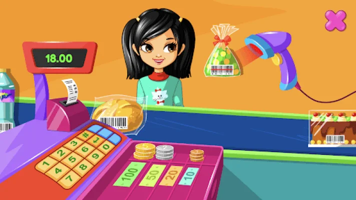 The cash register section allows players to scan items and issue invoices, while also learning about numbers and handling money like a real cashier. In the grocery section, players must find hidden objects like cakes, lollipops, chocolates, and juices to help their customers. In the cheese and salami section, players must sort different types of salami and cheese on a conveyor belt and place them in their designated boxes.