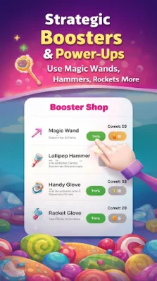 To help you win difficult levels and intense PvP matches, Sweet Blast offers pro boosters and strategic power-ups. These include a magic wand to instantly clear any candy or obstacle, a hammer to break through tough blocks, a glove to swap candies strategically, and a rocket and bomb to clear large areas quickly. And the more you play, the more you earn through the game's rewarding system. You can use virtual coins to purchase extra moves, lives, or powerful boosters.