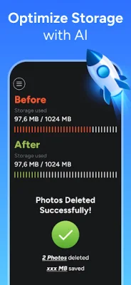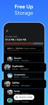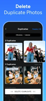 The app also has a duplicate photos cleaner feature, which instantly detects and groups duplicate photos. This allows you to quickly review and delete duplicates with just a swipe, saving you time while keeping your best shots. Additionally, by removing unnecessary photos, you can free up storage space and boost your device's performance without having to delete important apps or files.