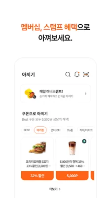 Syrup의 멤버십, 쿠폰, 스탬프 혜택들은 아끼기 메뉴에서 모두 만나볼 수 있습니다. 또한 어느 메뉴에서건 오른쪽 상단 바코드 아이콘을 누르면 멤버십에 바로 접근할 수 있습니다.
